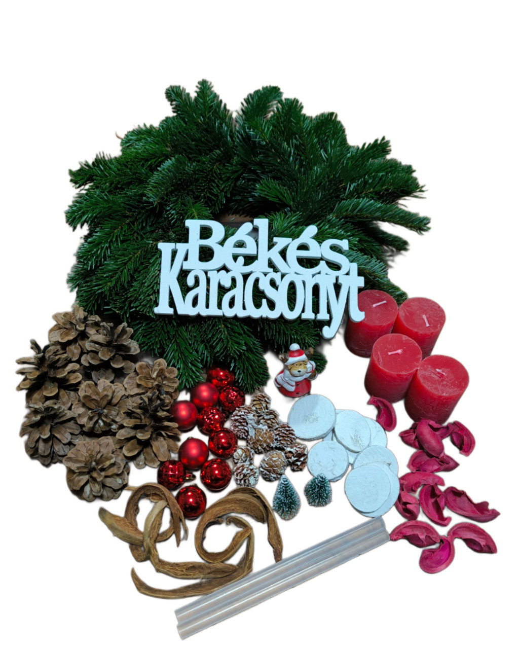 Összekészítettünk egy csomagot, amiben minden benne van egy györű adventi koszorú elkészítéséhez