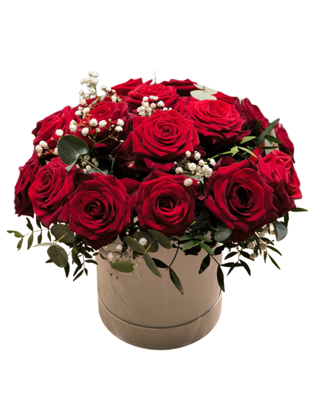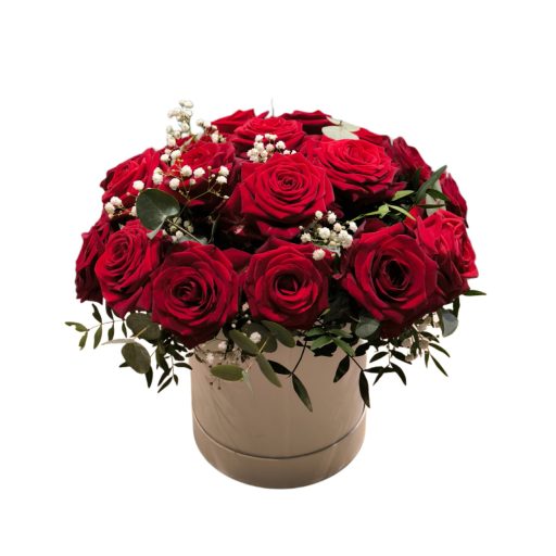 Prémium vörös rózsából és rezgőből készített virágdoboz.