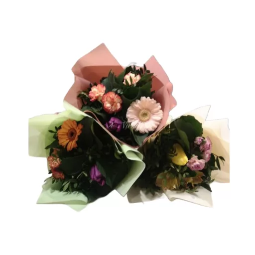 Készleten lévő színes vegyes virágokból készített kedves kis nőnapi virágcsokor.