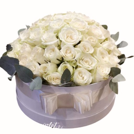 Nagy méretű impozáns virágdoboz fehér rózsából elkészítve.